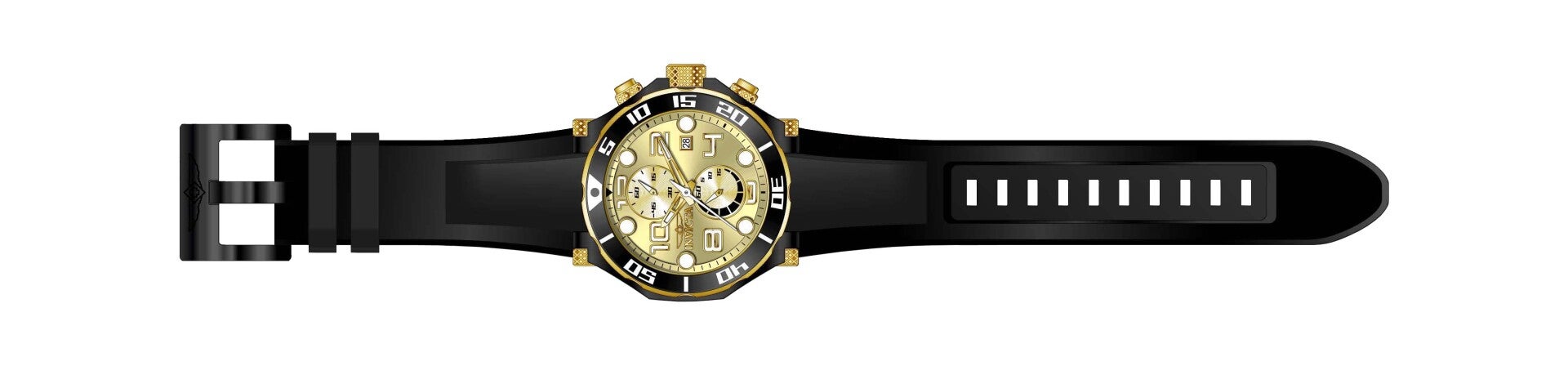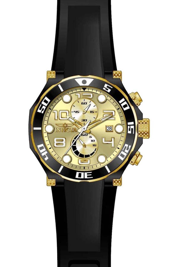 Denne imponerende Invicta Pro Diver-klokken har et presist kvartsurverk samt en gullfarget, svart urkasse. Den gullfargede metallskiven er omsluttet av et svært beskyttende Flame Fusion-krystall. Klokken har en sterk, svart silikonrem og er vanntett ned til 50 m.