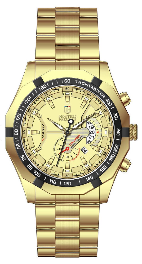 Denne vakre Montres Prestige-klokken har et presist kvartsurverk i tillegg til en gullfarget urkasse. Urskiven har en gullfarget kobberskive beskyttet av et svært motstandsdyktig Flame Fusion-krystall. Klokken har en gullfarget rem og er vanntett opptil 30 m.