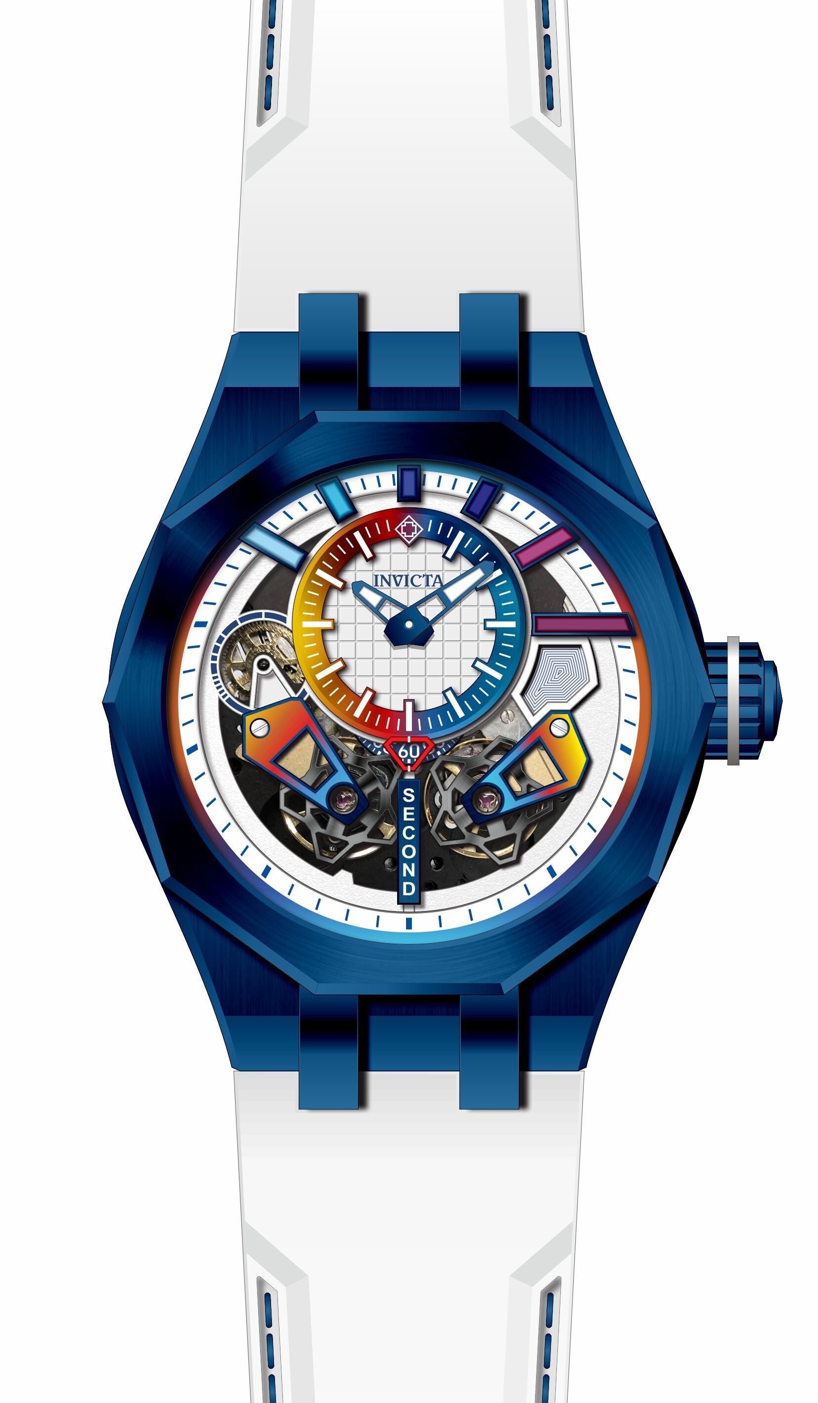 Denne iøynefallende Invicta-klokken fra Specialty-kolleksjonen er drevet av et nøyaktig automatisk urverk med en blå urkasse. Urskiven er dekorert med en hvit metallskive og beskyttet av en solid Flame Fusion Crystal. En hvit silikonrem fullfører denne klokken som tåler vann i opptil 100 m.