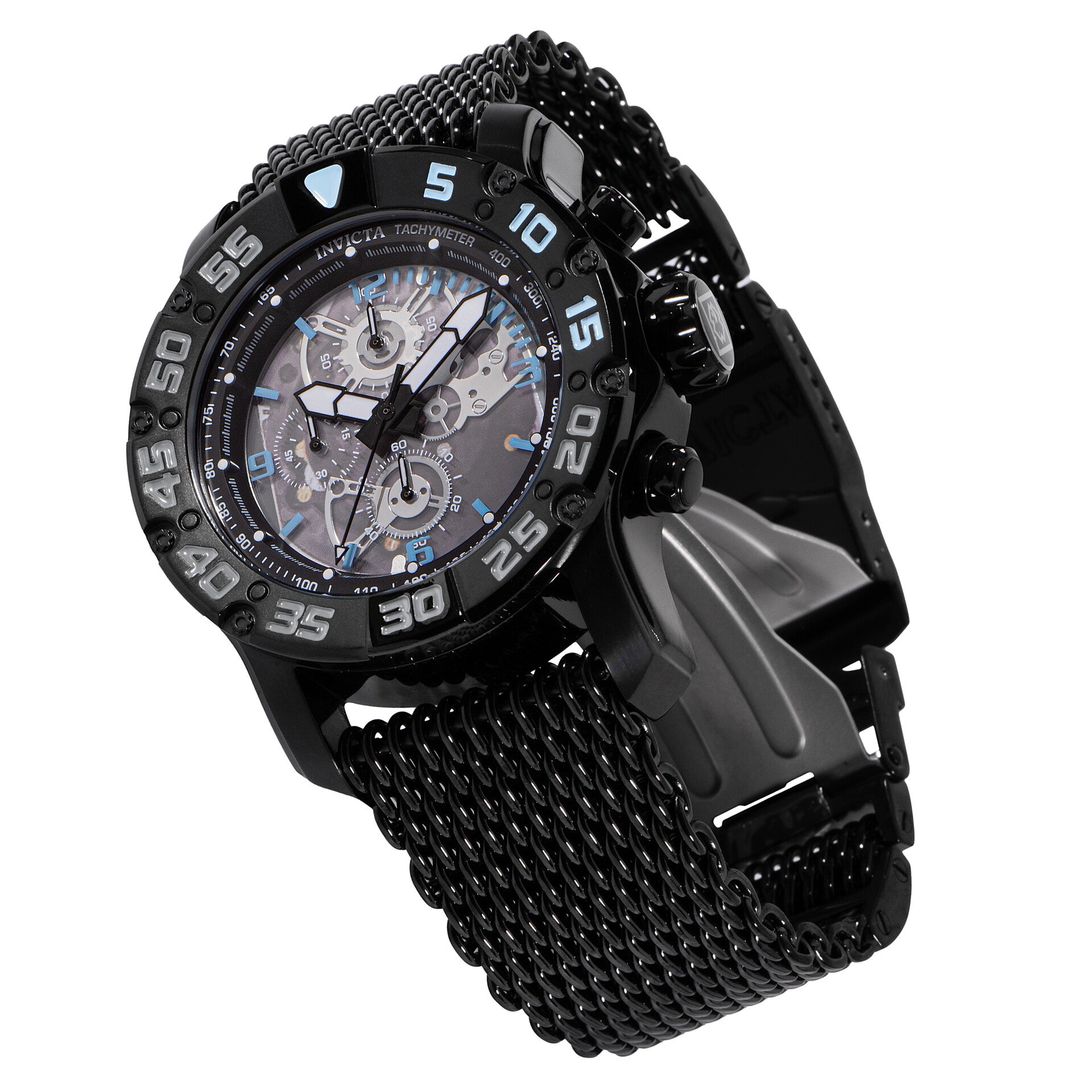 Denne iøynefallende Invicta-klokken fra Invicta Racing-kolleksjonen er drevet av et nøyaktig kvartsurverk med svart urkasse. Urskiven er dekorert med en svart plastskive og beskyttet av et solid mineralglass. En svart rem fullfører denne klokken som tåler vann i opptil 100 m.