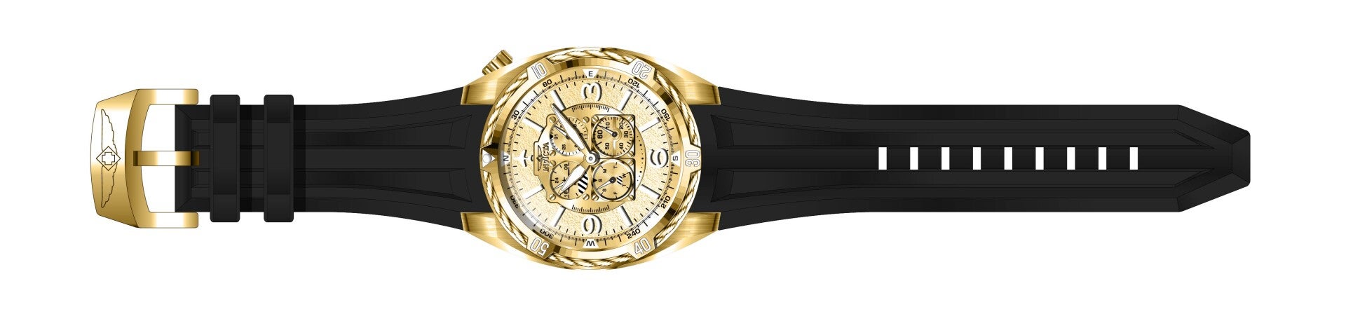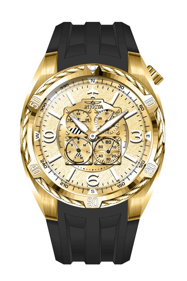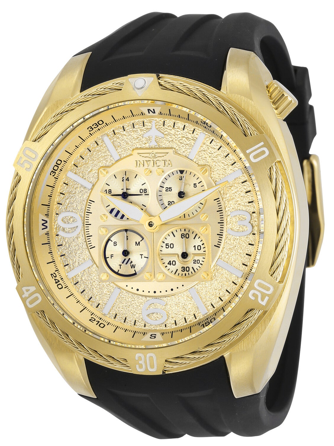 This incredible Invicta watch from the Aviator collection offers an exact Quartz movement, with an incredible gold case. The face displays a gold, metal dial protected by our proprietary Flame Fusion Crystal. The design is completed by a black, silicone, polyurethane band. This timepiece can resist water for up to 100 m.