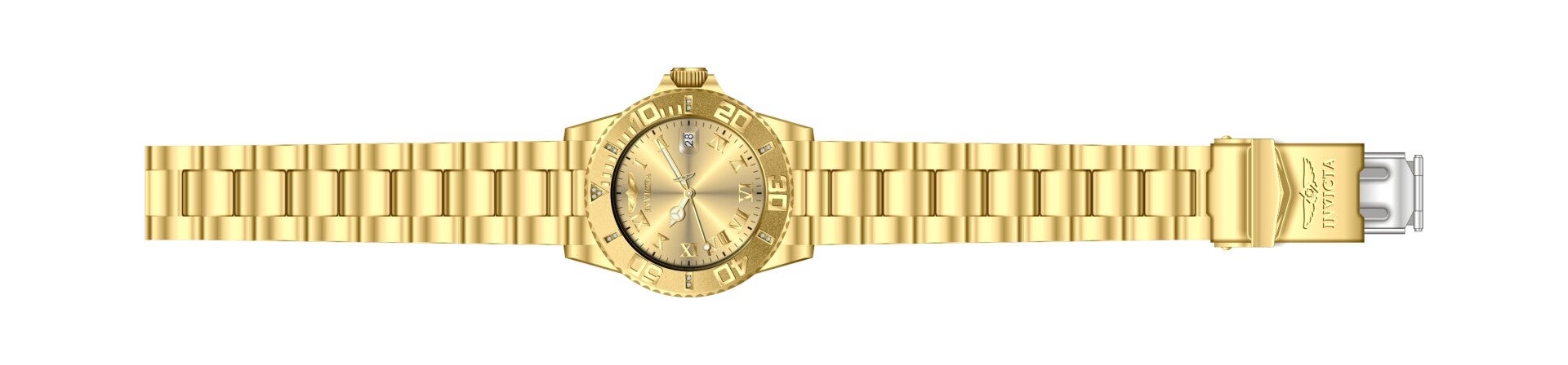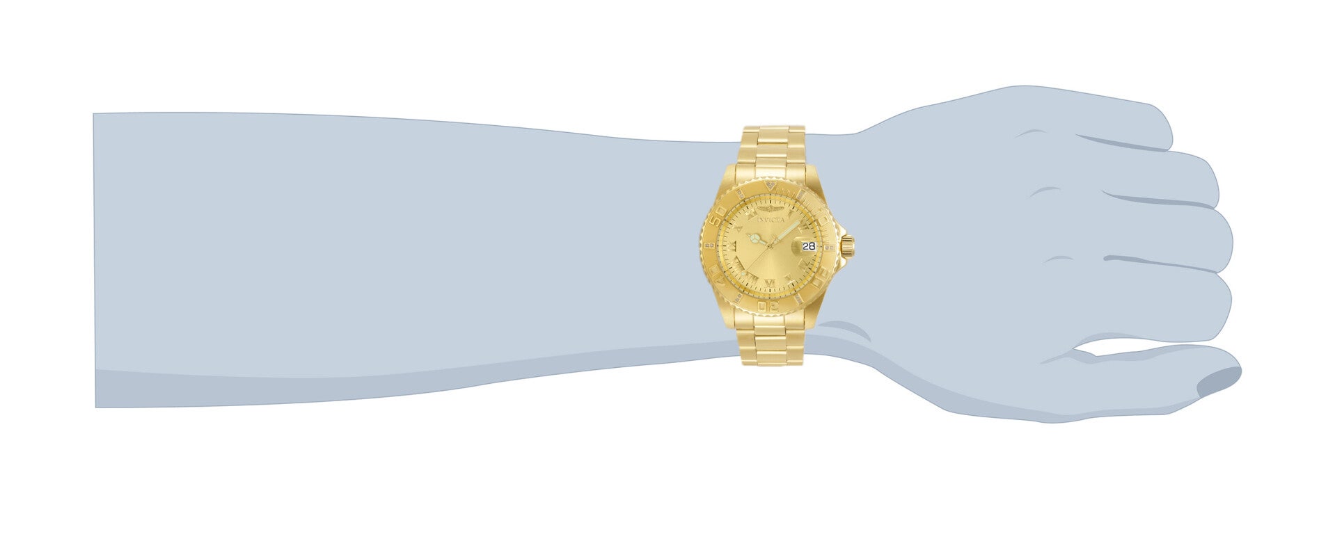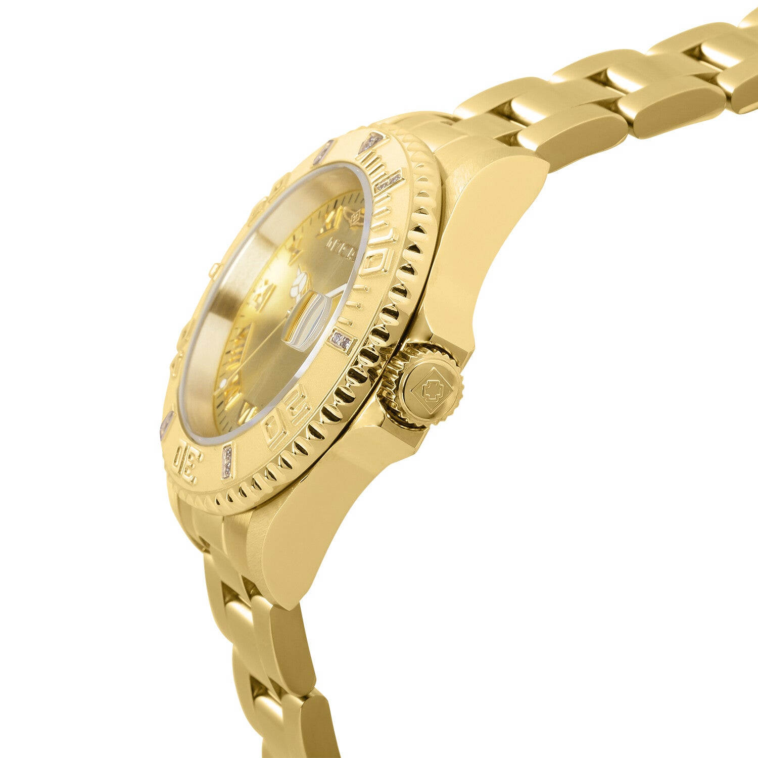 Denne utrolige Invicta-klokken fra Pro Diver-kolleksjonen har et eksakt kvartsurverk med utrolige 0,06 karat autentiske diamanter og en sofistikert gullkasse. Urskiven har en gullfarget metallskive beskyttet av vårt proprietære mineralkrystall. Designet fullføres av en gullfarget rem i rustfritt stål. Denne klokken tåler vann i opptil 200 meter.